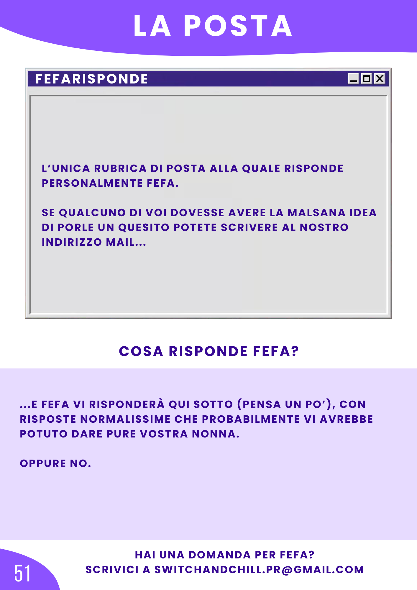 La posta di Fefa: voi scrivere, lei risponde. La mail a cui scrivere è SWITCHANDCHILL.PR@GMAIL.COM